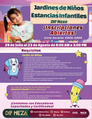 Nezahualcóyotl, Edoméx- 24 de Julio del 2024.- Con el objetivo de ofrecer a los padres y madres de familia opciones educativas de calidad y seguras para sus hijas e hijos a costos accesibles, la directora general del SMDIF, Claudia Mónica Pérez, anunció que las inscripciones para el ciclo escolar 2024-2025 de los 9 jardines de niños y 8 estancias infantiles, pertenecientes a dicha instancia gubernamental, darán inicio el próximo 29 de julio y concluirán el 23 de agosto.
